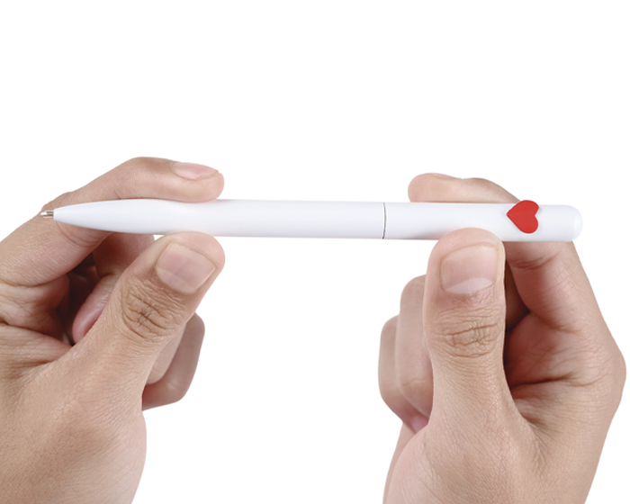 QUEEN - Bolígrafo metálico mate con detalle de corazón, de tinta negra. Al grabar la parte inferior destapa en color plata mate y al grabar la parte superior en CO2, destapa en plata brillante. Mecanismo retráctil.
