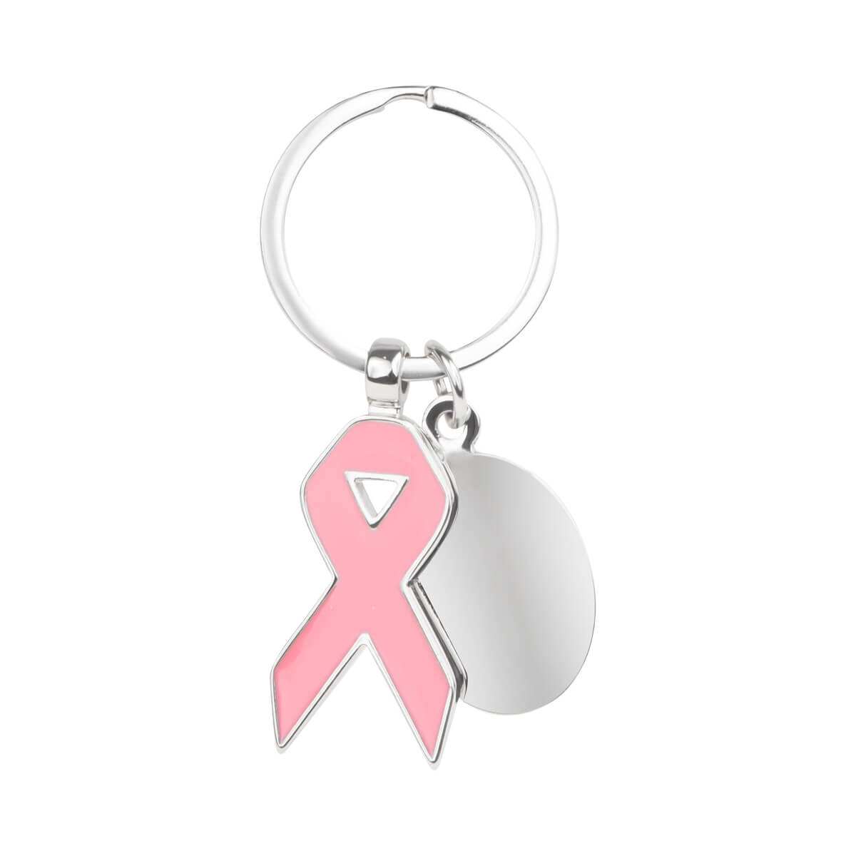 LLAVERO ROSAE - Llavero metálico con diseño en forma de listón rosa y placa redonda para grabado. Símbolo de apoyo y concientización del cáncer de mama. Personalízalo con una fecha especial, un nombre o el mensaje que desees. Además de mantener tus llaves organizadas, es un accesorio elegante, significativo y funcional.