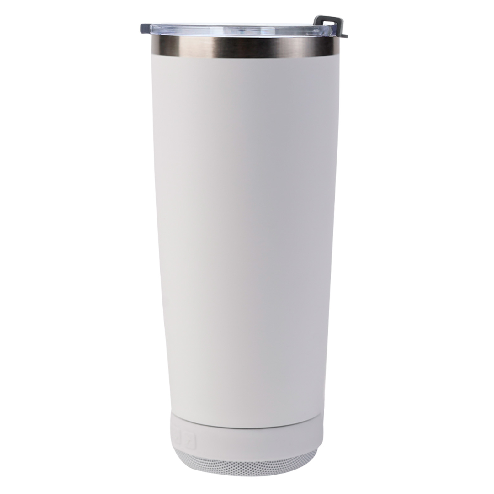 DOPIO Termo aislado al vacío con doble pared de acero inoxidable, acabado plastic painting, equipado con bocina Bluetooth que cuenta con controles de volumen, botón de reproducción, efectos de luz y puerto para tarjeta TF. Incluye cable tipo C. La bocina es removible de la base del termo.