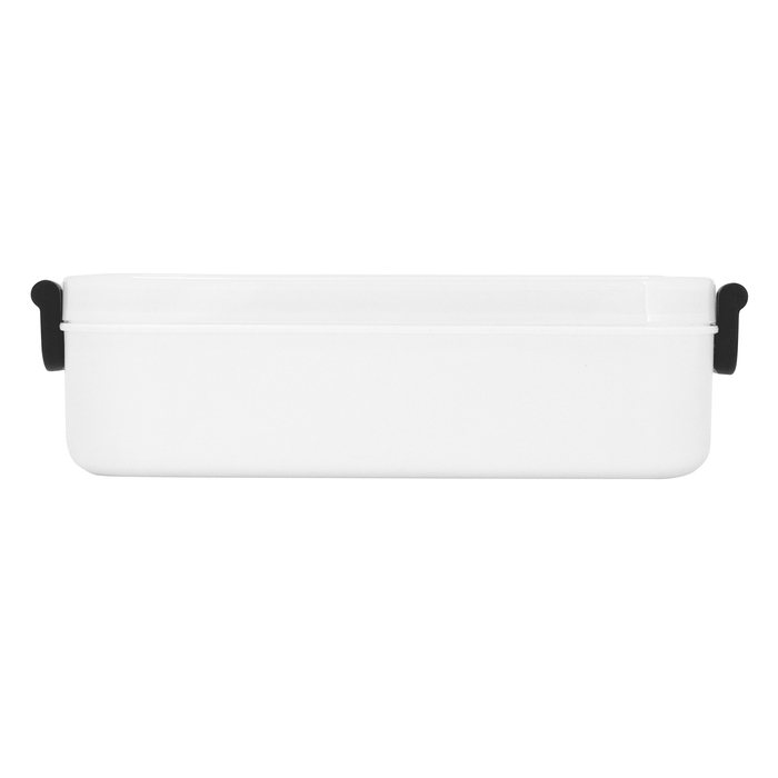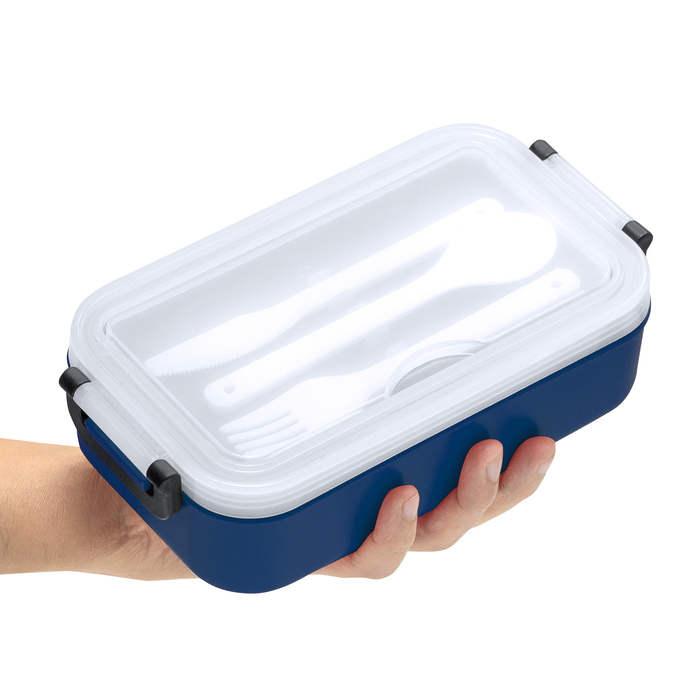 LONCHERA "CHECA" Contenedor de alimentos. Tapa translúcida con bandeja porta cubiertos, anillo de silicona antiderrame y ajustes de seguridad en sus laterales. Set de 3 cubiertos plásticos de color blanco (tenedor, cuchillo, cuchara) de 15 cm de largo