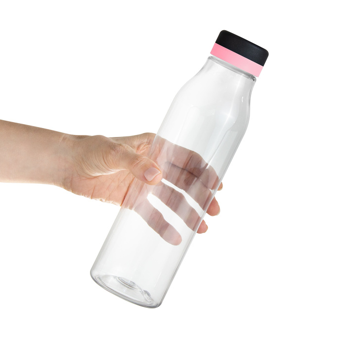 Botella "ANDINA BLACK" Botella de plástico transparente con tapa a rosca color negro mate con anillo de silicona de diferentes colores