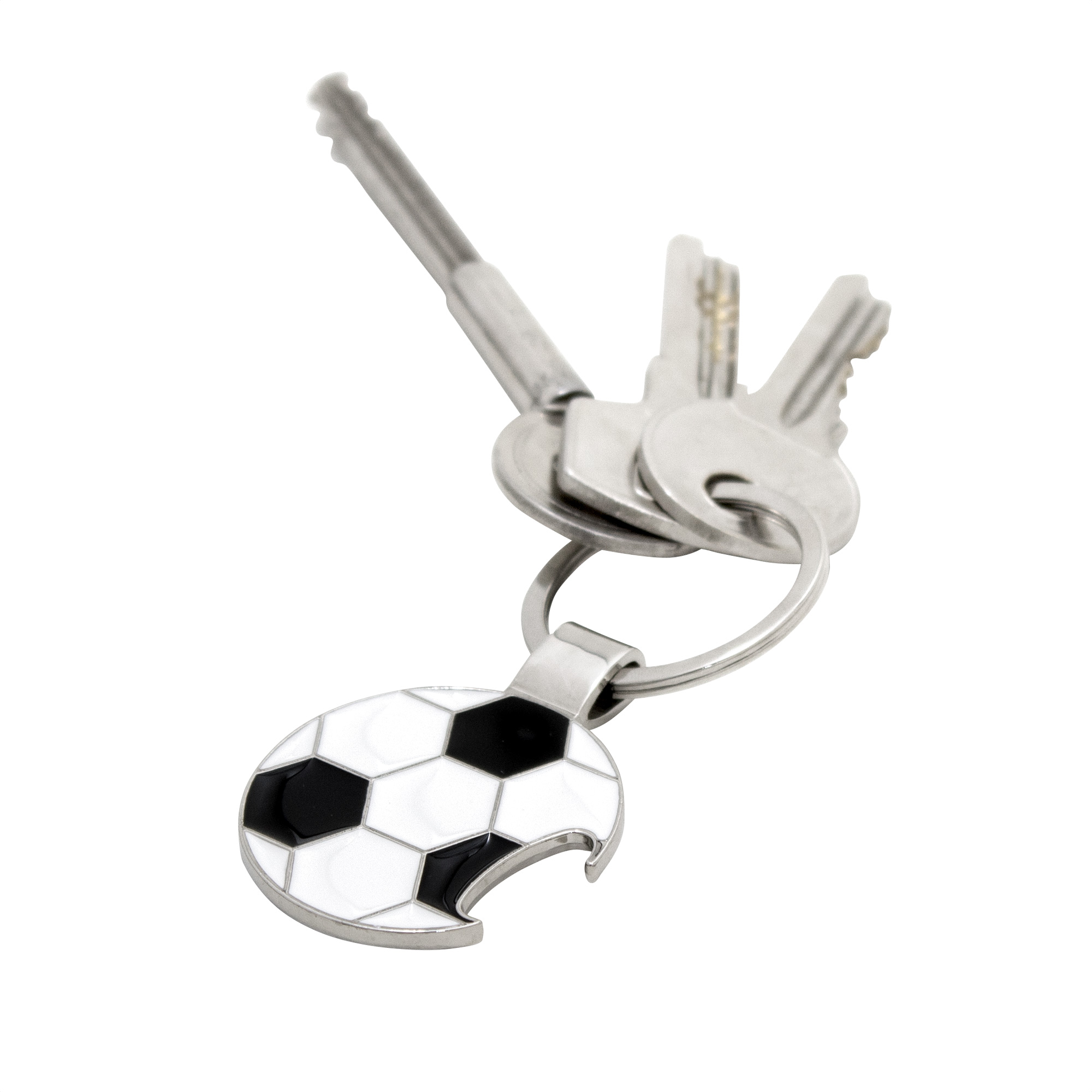 Llavero destapador "PORTER" Llavero con destapador abre botellas. Estructura metálica con forma de pelota de fútbol pintada con esmalte brillante de colores negro y blanco