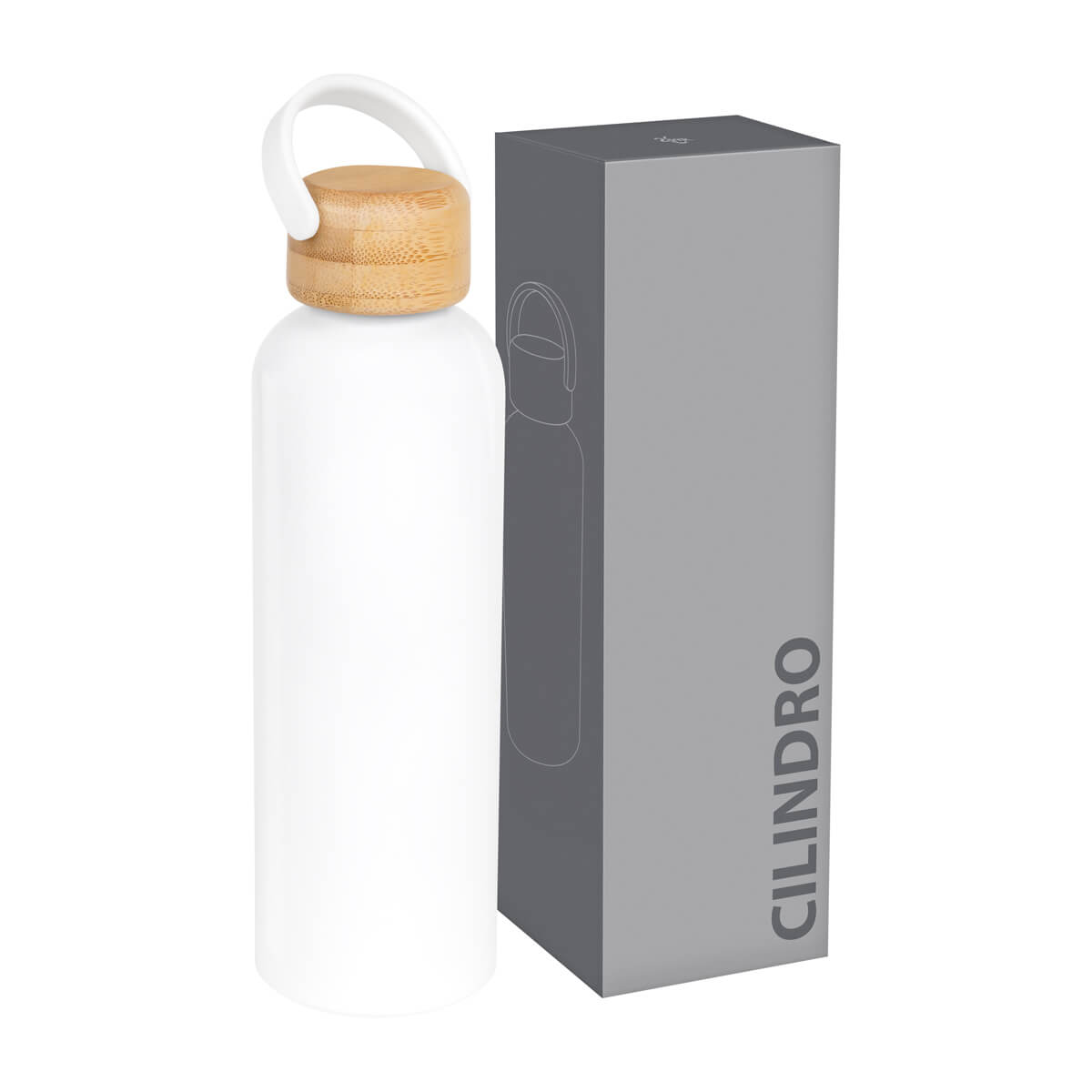 CILINDRO TAKE - Cilindro metálico para sublimar de una pared. Tapa de bambú con cierre de rosca y asa de plástico. Incluye caja individual. El bambú es un producto natural el cual puede presentar variaciones en tonalidades y vetas.