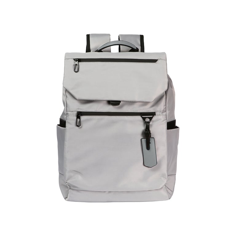 Mochila fabricada en tela poliéster tipo Oxford caracterizada por su resistencia al agua y nylon, con forro interior de poliéster. Cuenta con un compartimento principal, dos compartimentos frontales con cierre, y dos laterales. Tiene dos correas ajustables y acolchonadas para mayor comodidad y un asa superior con detalle en PU. Incluye también un identificador en PU.