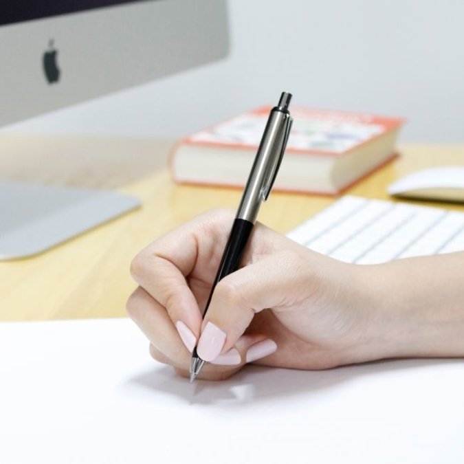 Kanji Bolígrafo Japonés de mecanismo retráctil. Hecho en 2 materiales. La parte de acero inoxidable permite grabado en oxidación. Mientras que el extremo de plástico define el color y le da ligereza al producto. Escritura de alto desempeño debido a su repuesto japonés de tinta Gel Negra. Incluye funda de terciopelo negra.