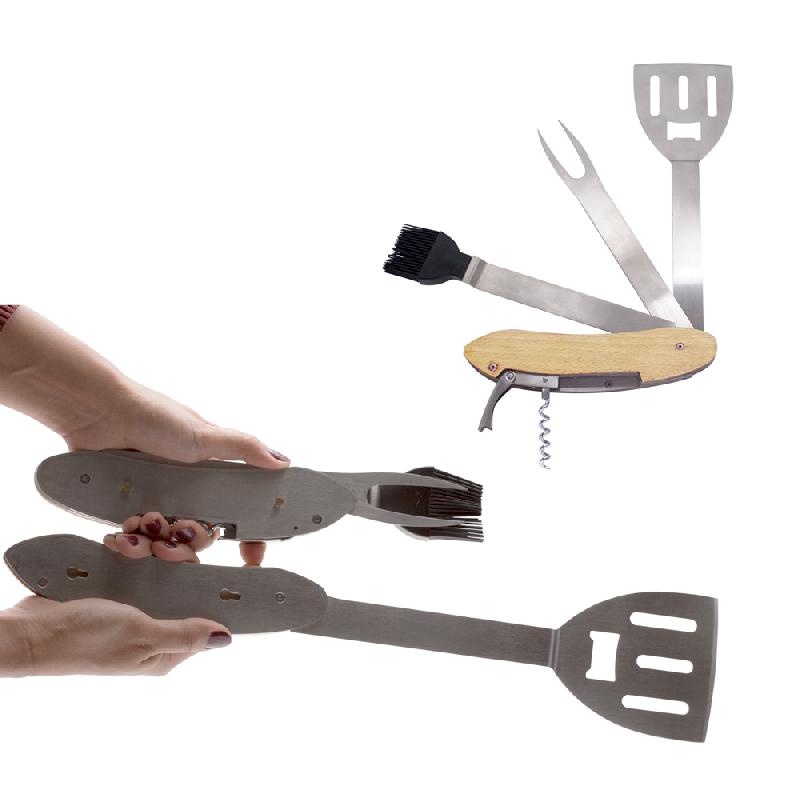 Set para parrilla con mango de madera. Medidas: 43cm x 4cm x 2.4 cm Material: Madera y acero inoxidable.