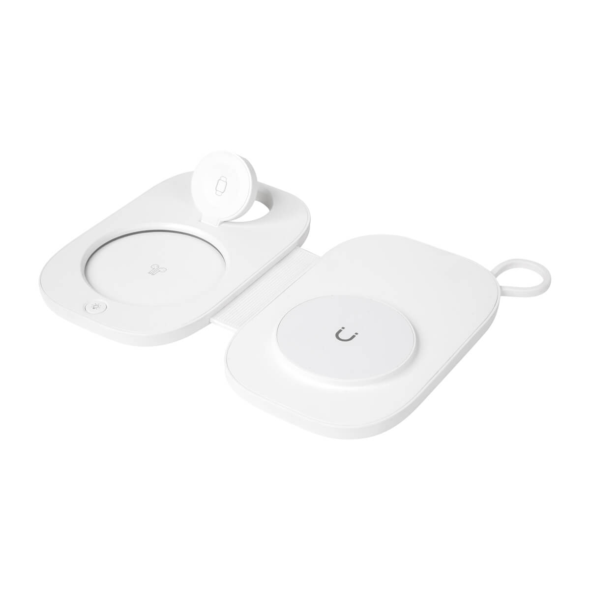 MULTICARGADOR INALÁMBRICO XENEO - Estación de carga inalámbrica con triple función. Diseño plegable que facilita su transporte, almacenamiento y uso diario. Cuenta con asa de silicón para llevarla cómodamente a todos lados. Incluye estaciones de carga rápida para smartphone, reloj inteligente y audífonos. Incorpora una luz LED en la estación de los audífonos. Incluye cable de 1 metro con conector tipo C. Compatible con dispositivos que integren tecnología de carga inalámbrica. Incluye caja individual.