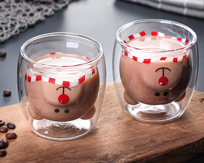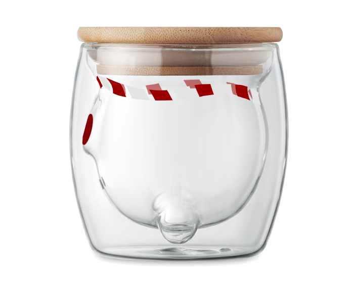 COPITO - Vaso de vidrio de borosilicato de doble pared con cara de oso con bufanda. Cuenta con tapa de bambú y sello de silicón. CAP. 220 ml. Presentación: caja en color blanco.