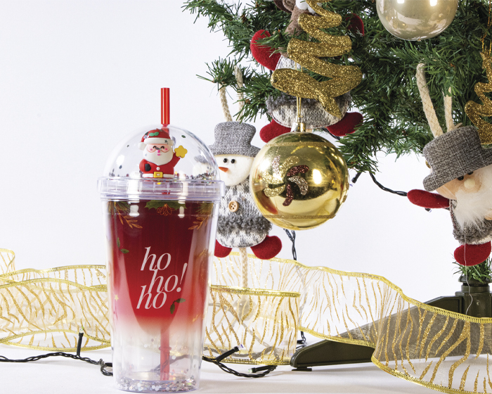KLAUS - Vaso de plástico de doble pared con diseño navideño y lentejuelas en su interior. Cuenta con tapa de cúpula con figura de Santa Klaus con lentejuelas y popote. CAP. 500 ml. Presentación: caja de regalo de color. *BPA FREE.