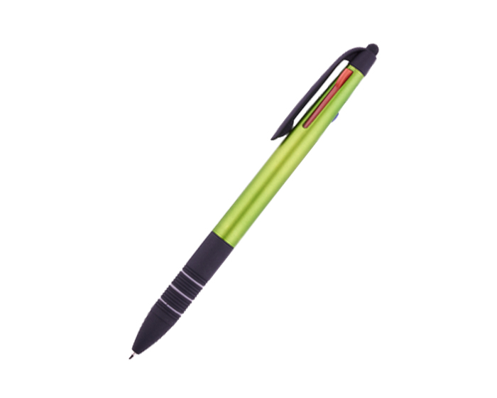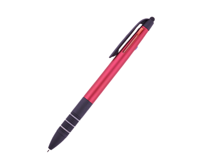 MULTIPEN - Bolígrafo plástico con terminado metalizado. Tiene integradas 3 tintas: negra, roja y azul. Parte inferior con goma antideslizante en negro con detalles de arillos en gris. Cuenta con touch para dispositivos táctiles. Mecanismo deslizante para cambio de tinta.