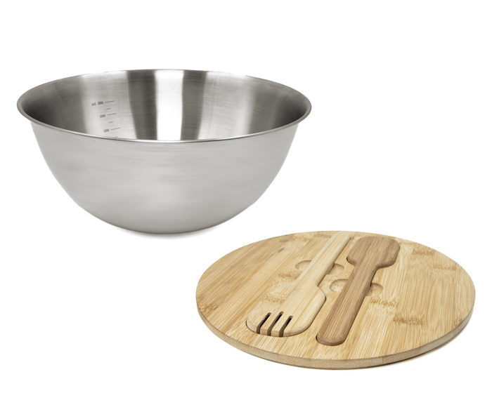 MATERIAL: Acero Inoxidable / Bambú MEDIDAS: Ø 24.3 x 12 cm IMPRESION: GL MED. EMPAQUE: 52 x 42 x 27 cm PESO EMPAQUE: 6 kg PIEZAS EMPAQUE: 6