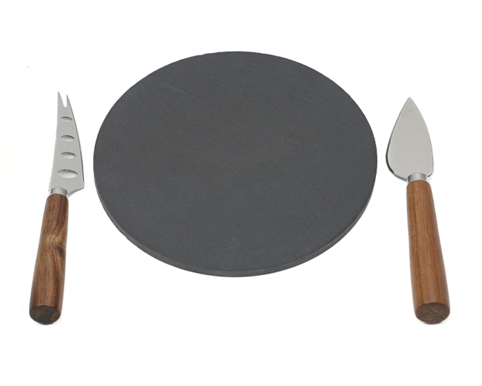 MATERIAL: Tabla: Piedra // Cuchillos: Acero inoxidable / madera de acacia. MEDIDAS: Base: Ø 15 cm / Cuchillo 1: 2.5 x 15 / Cuchillo 2: 2.1 x 16.5 / Estuche: 19.5 x 25.5 x 2.6 cm IMPRESION: GL MED. EMPAQUE: 41.5x 28.5 x 28.5 cm PESO EMPAQUE: 12.2 kgs PIEZAS EMPAQUE: 20
