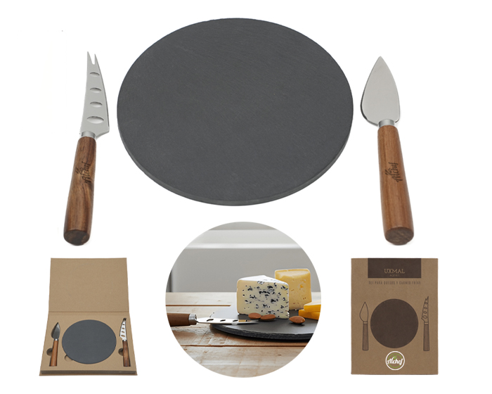UXMAL - Set para quesos y carnes frías. Incluye 2 cuchillos de acero inoxidable con mango de madera de acacia y una base de piedra. Presentación: caja individual