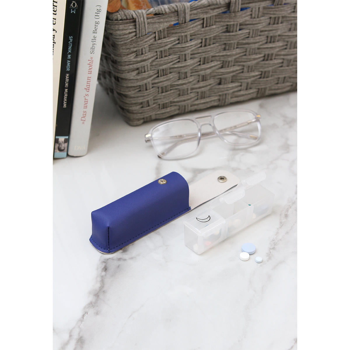Pastillero Linden. - Pastillero rectangular de plástico con funda de curpiel con cierre de broche. El pastillero cuenta con tres compartimentos individuales para pastillas o cápsulas. Es un accesorio práctico y conveniente para organizar y llevar tus medicamentos de manera segura.