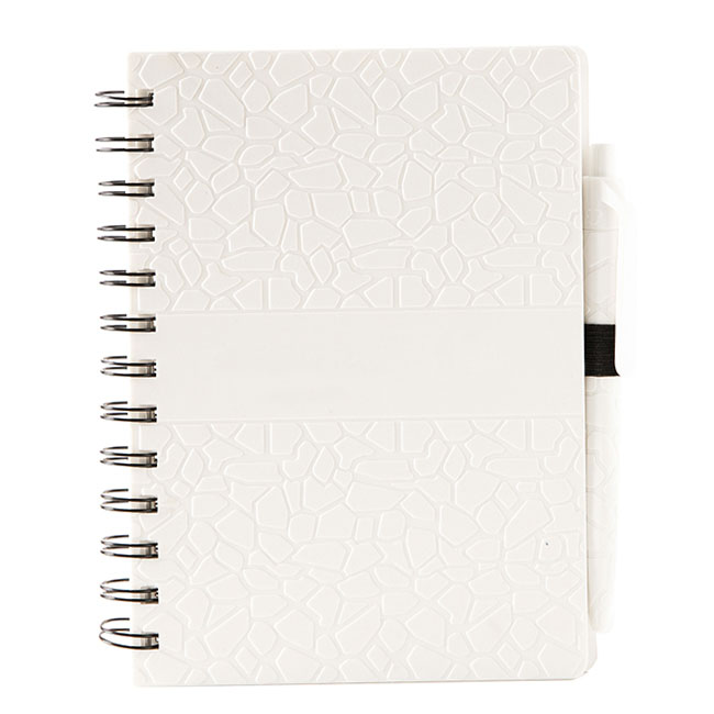 Libreta Troya Libreta Troya • Libreta con 70 hojas rayadas. • Carátula con diseño tipo piedra. • Incluye bolígrafo de plástico reciclado. • Colores disponibles: blanco y negro. Material: ABS reciclado Medidas: 18 x 3 cm Impresión: Serigrafía Áreas de impresión: • Libreta: 6 x 1.5 cm • Clip del bolígrafo: 3 x 0.5 cm