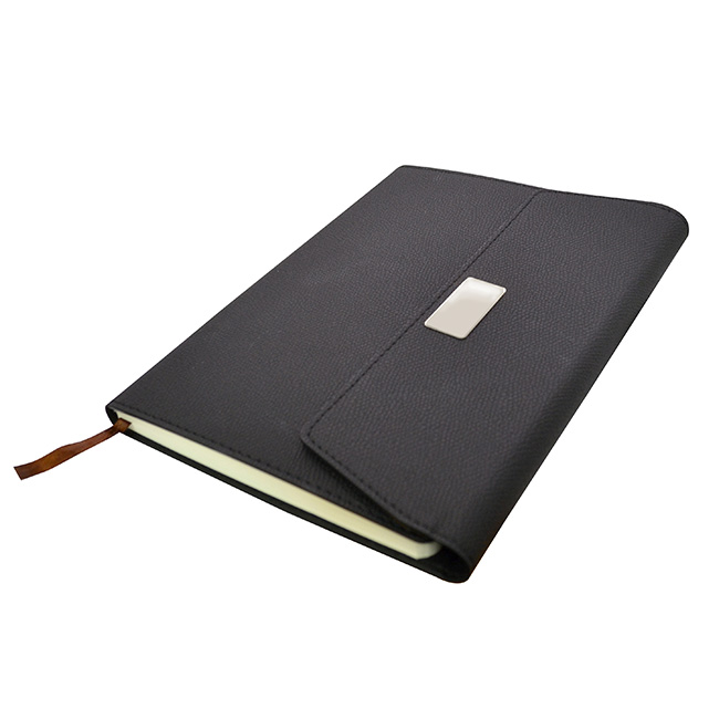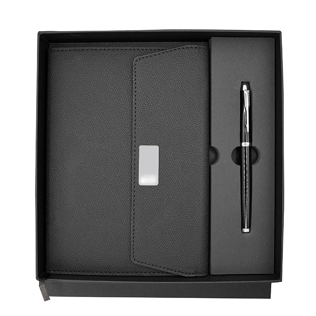 l Incluye libreta y bolígrafo en estuche de presentación. l Libreta con 80 hojas rayadas y planeador atemporal. l Cinta divisoria. l Cierre con ceja magnético y placa para personalizar. l Bolígrafo de metal con mecanismo rotativo. l Colores: Negro.