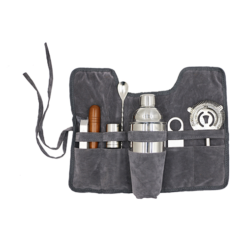 BARMAN Set de coctelería. Incluye 8 accesorios: funda, shaker, medidor, cucharilla, mortero, destapador, pinzas y colador / mezclador.