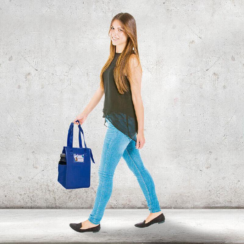 Lonchera con asa para fácil agarre, malla lateral, cierre y compartimento translúcido para guardar identificación. Medidas: 21 x 31.5 x 17.5 cm Material: Non woven.