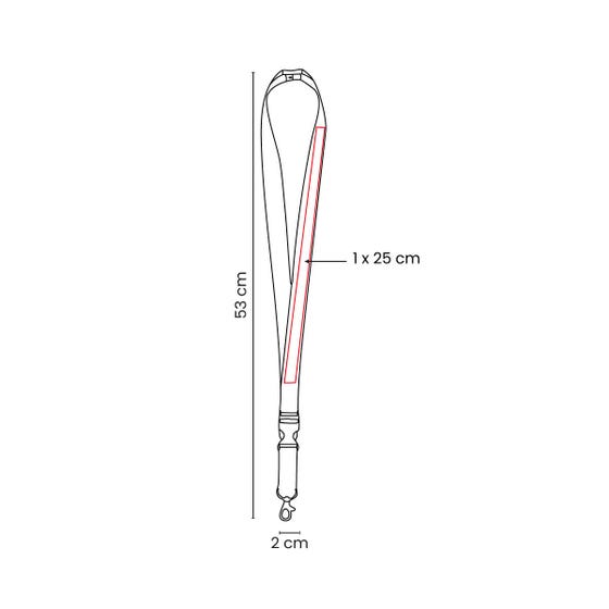 MATERIAL: Poliéster / Plástico MEDIDAS: 2 x 53 cm IMPRESION: Serigrafía MED. EMPAQUE: 49 x 32 x 29 cm PESO EMPAQUE: 67.5 Kg PIEZAS EMPAQUE: 500