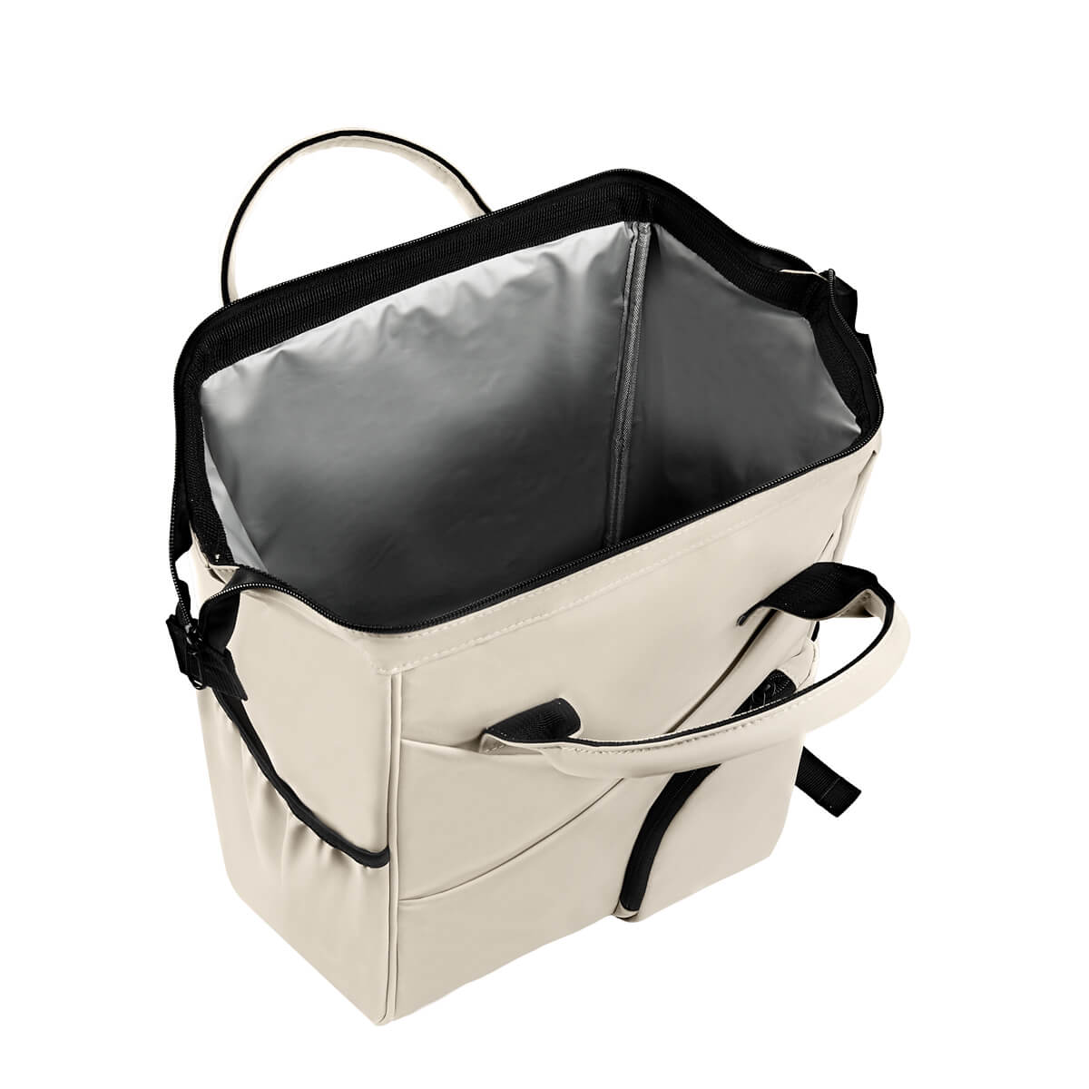 MOCHILA-LONCHERA VERTEX - Lonchera práctica y versátil de gran capacidad. Su interior plastificado, facilita su limpieza y conserva mejor tus alimentos. El compartimiento principal, cuenta con un marco metálico, lo que brinda mayor comodidad al introducir o extraer lo que necesites. El diseño cruzado con bolsillo oculto en la parte frontal, le brindan un toque moderno y funcional, mientras que el compartimento frontal con cierre, es perfecto para almacenar accesorios pequeños. Sus dos bolsillos laterales, son ideales para termos o botellas. Gracias a sus asas ajustables, también puedes llevarla cómodamente como mochila, convirtiéndola en la compañera ideal para tu día a día. Capacidad 20 latas .