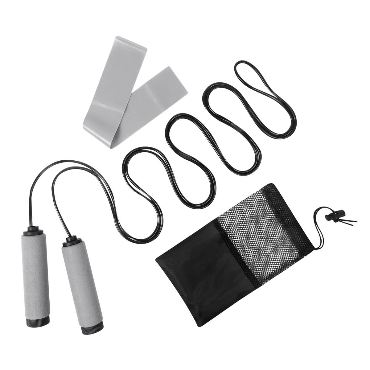 SET FITNESS FORTIA - Set deportivo con accesorios para entrenamiento funcional. Contiene una cuerda para saltar y una banda de resistencia. Ligero, práctico y listo para acompañarte en cada rutina. Incluye bolsa con jareta.
