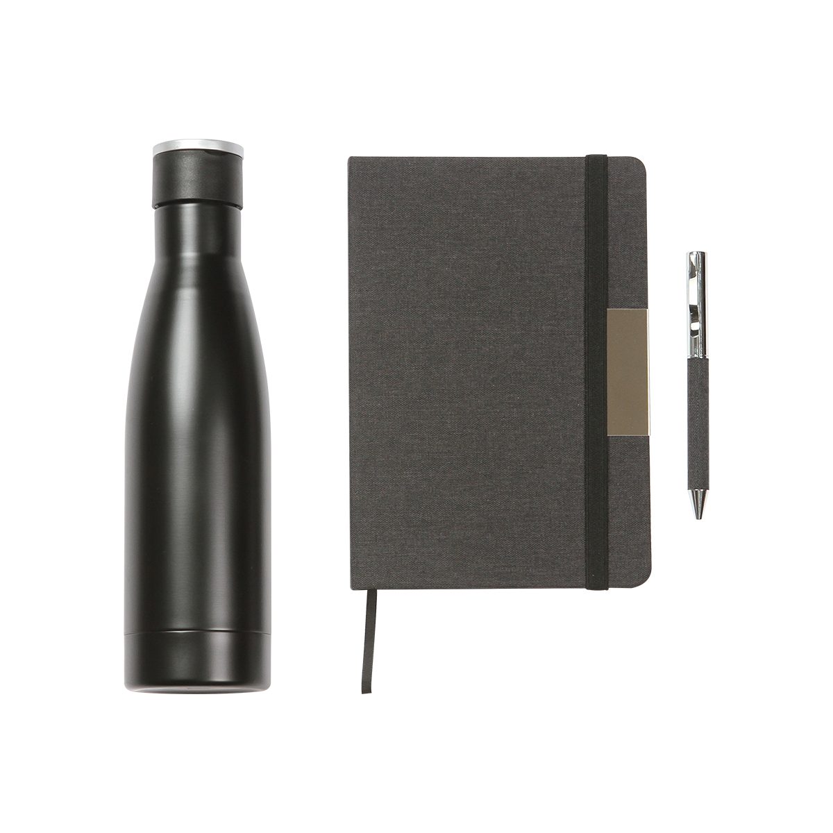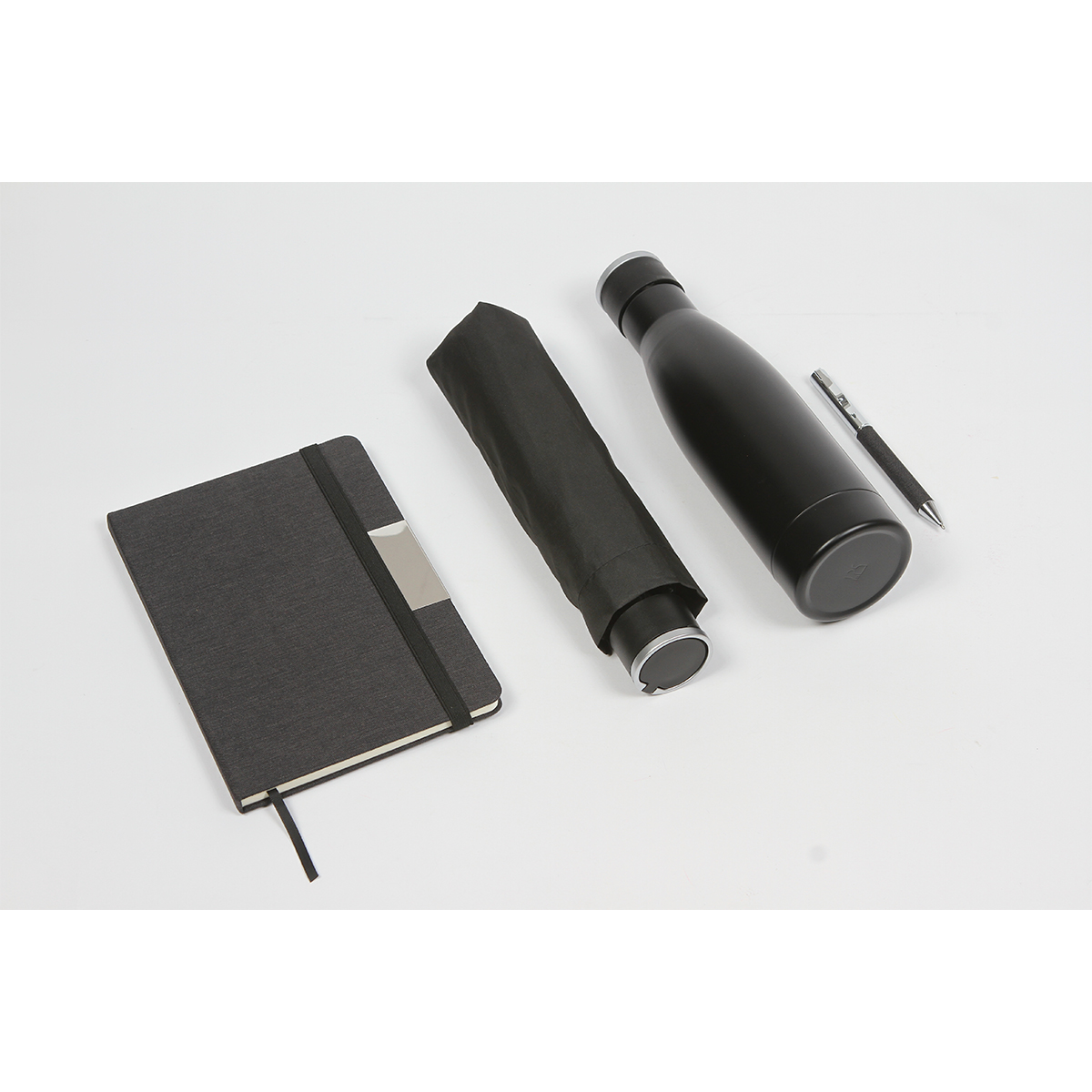 MEDIDAS: Caja: 35.5x31.5x7.5 | Libreta: 14.7x21.3x1.3 | Botella: 26.3x7 | Paraguas: 25.5x5 | Bolígrafo: 13.1x IMPRESION: Grabado láser / Serigrafía / Tampografía MED. EMPAQUE: 37.5x33x40 PIEZAS EMPAQUE: 5