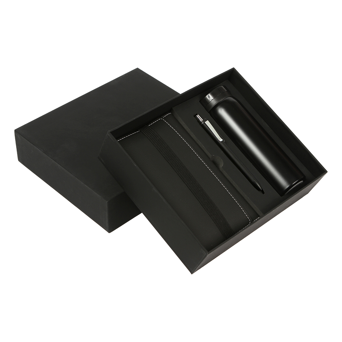 Set ejecutivo Bower. - Set ejecutivo, incluye libreta con cubierta fabricada en curpiel con 80 hojas de 70g, bolígrafo con barril plástico de apariencia metálical y termo de doble pared fabricado en acero inoxidable. Incluye caja de regalo color negro.