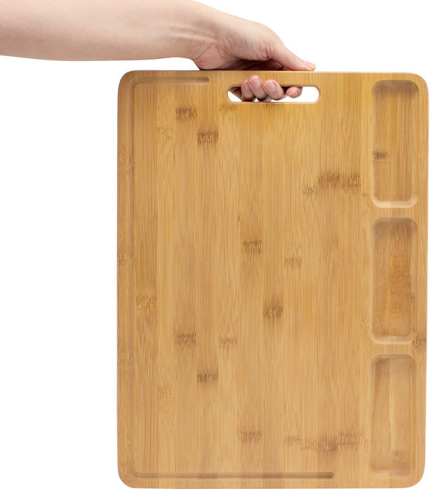 TABLA DE CORTE "BAMBOARD" Tabla de corte en Bambú. Tres compartimentos para armar botanas y llevarlas directo a la mesa. Transportable con manija incluida. Presentación en caja de regalo.