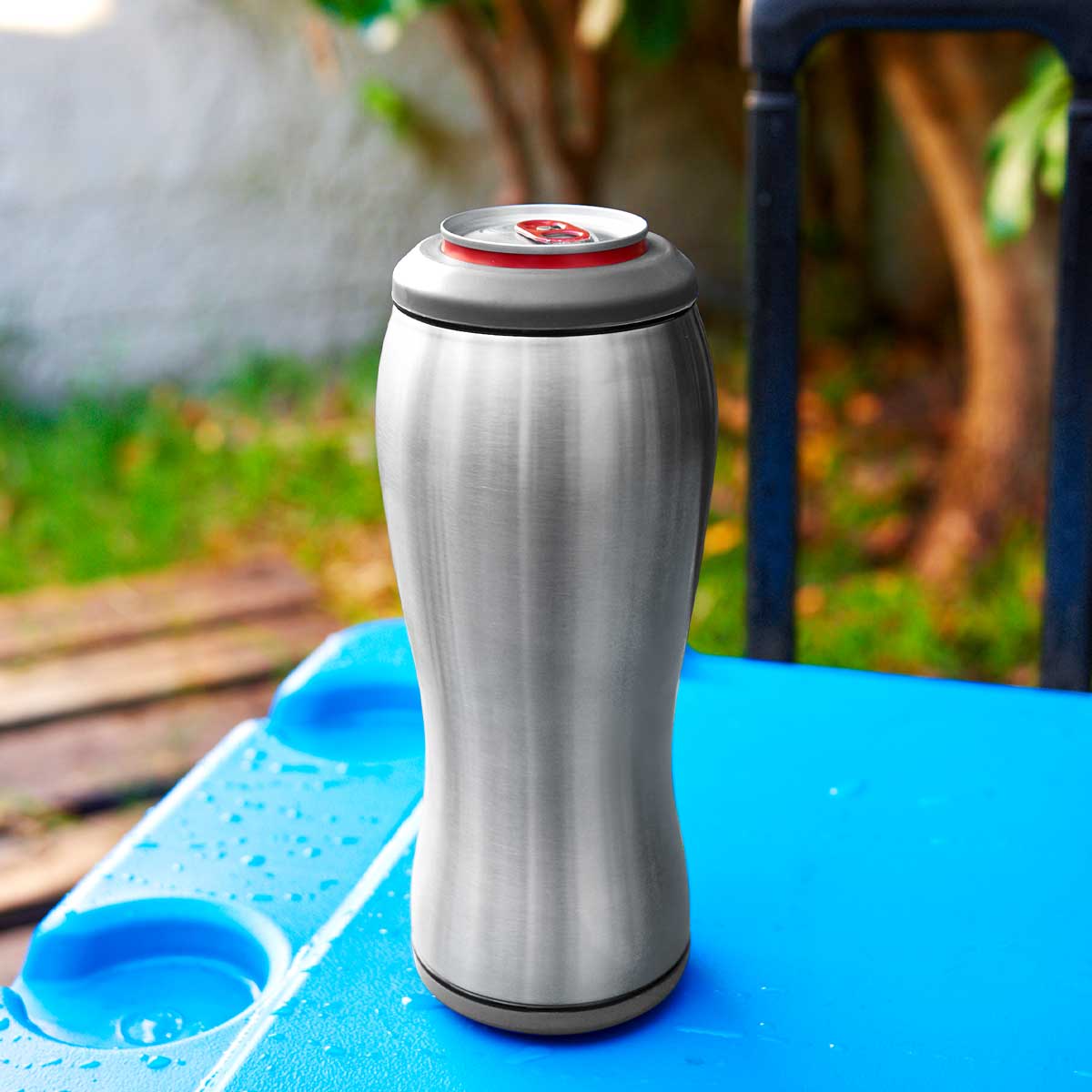 TERMO TERAMO - Doble pared. Pared interna y externa acero inoxidable. Tapas intercambiables para lata o botella. Mantiene la bebida fría. Incluye caja individual.