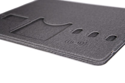 MOUSE PAD MULTIFUNCIONAL CON CARGA INALÁMBRICA Mouse pad multifuncional con carga inalámbrica: plegable e impermeable, cuenta con soporte para tarjetas y teléfono, bandeja para bolígrafos, interfaz de carga y superficie de precisión para el mouse. Incluye cable tipo C.