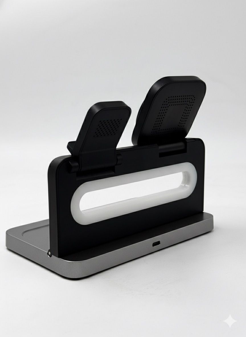 CARGADOR MAGNÉTICO 3 EN 1 Base de carga inalámbrica portátil 3 en 1 (smartphone, smartwatch y auriculares). Cuenta con iluminación LED. Incluye cable USB tipo C