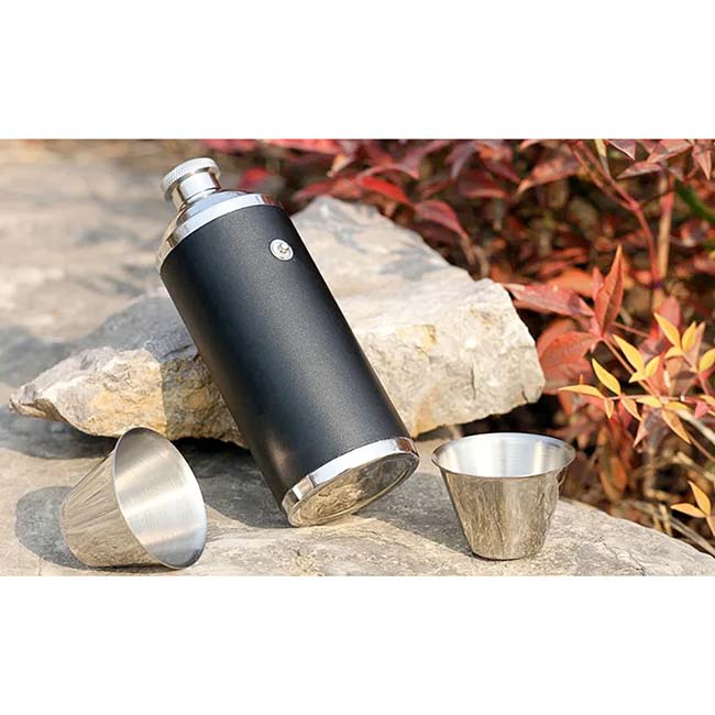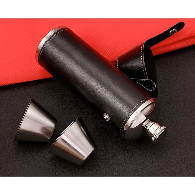 MATERIAL: Acero inoxidable. Funda curpiel. MEDIDAS: 18.5 x 5 cm diámetro MED. EMPAQUE: 41 x 30 x 40 PESO EMPAQUE: 13.5 kgs PIEZAS EMPAQUE: 70 pcs