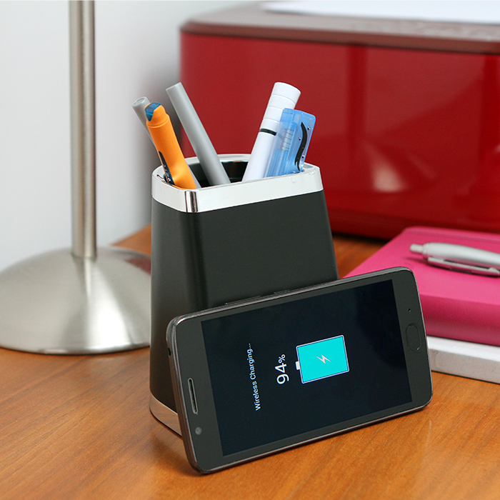 Porta lápices Meru. - Porta lápices con cargador wireless, fabricado en ABS con base para porta celular. Cuenta con compartimentos de almacenamiento para tus lápices, bolígrafos y otros utensilios de escritura. Capacidad de carga inalámbrica, con una potencia de carga de 10 W.