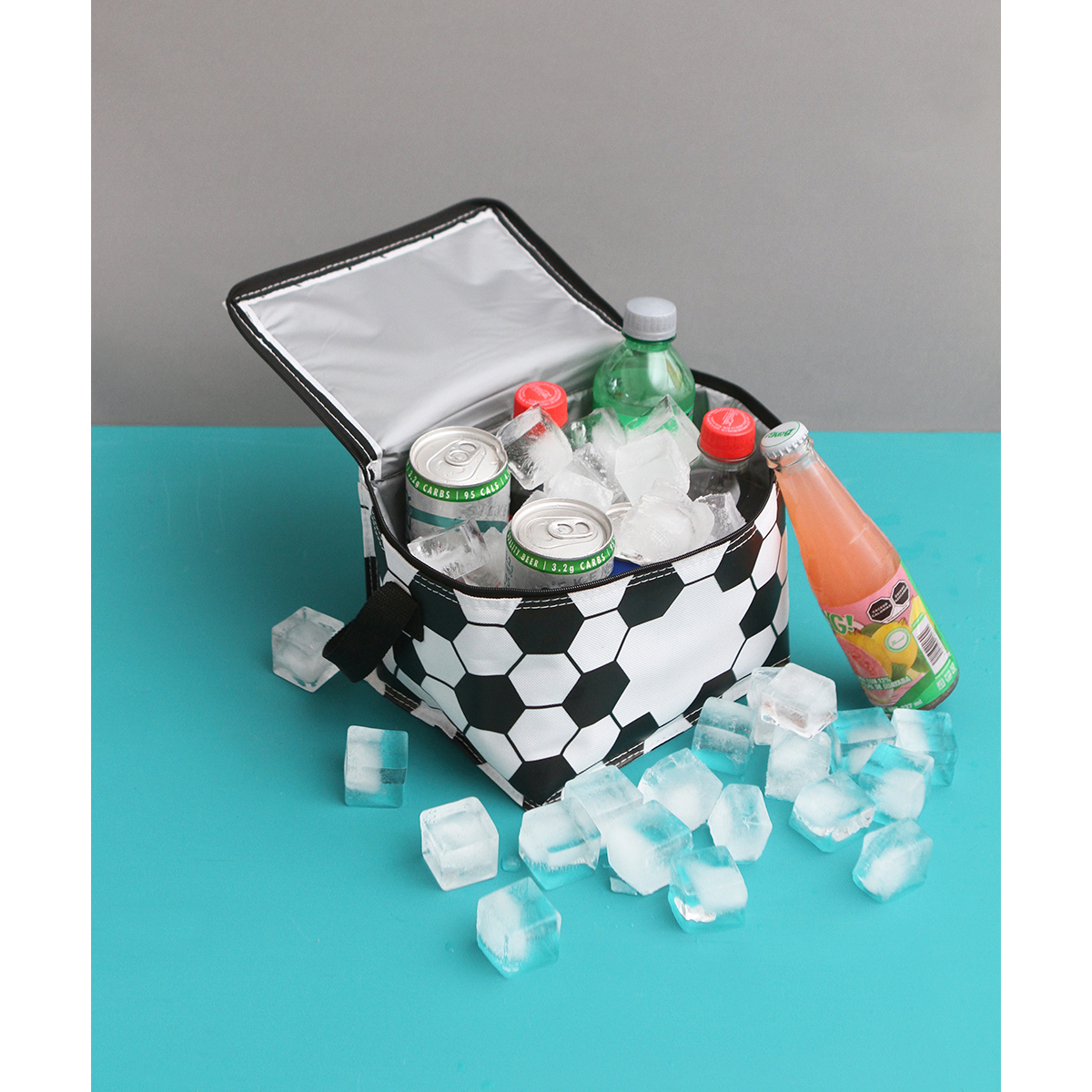 Hielera Noratus. - Mantén tus bebidas frías y tu estilo en alto con esta hielera pequeña de 3.5 litros, diseñada con un divertido diseño de balón de fútbol. Fabricada en poliéster resistente con forro interno de PEVA, ayuda a conservar la temperatura de tus alimentos o bebidas por más tiempo, ideal para llevar a partidos, picnics, escuela o salidas rápidas.