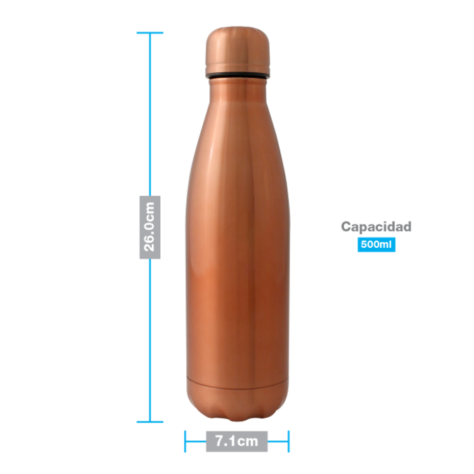 Ánfora Stahl / Ánfora Stahl Colors Termo con forma de botella que mantendrá tu bebida fría durante 24 horas o caliente durante 12 horas. Acabados mate y de alto brillo. Hecho de acero inoxidable con doble pared. Tapón con sellado de vacío que mantiene fresco el líquido que contenga y evita al 100% cualquier derrame. Se entrega en caja de cartón individual. Capacidad: 500 ml. Lavar antes de usar.